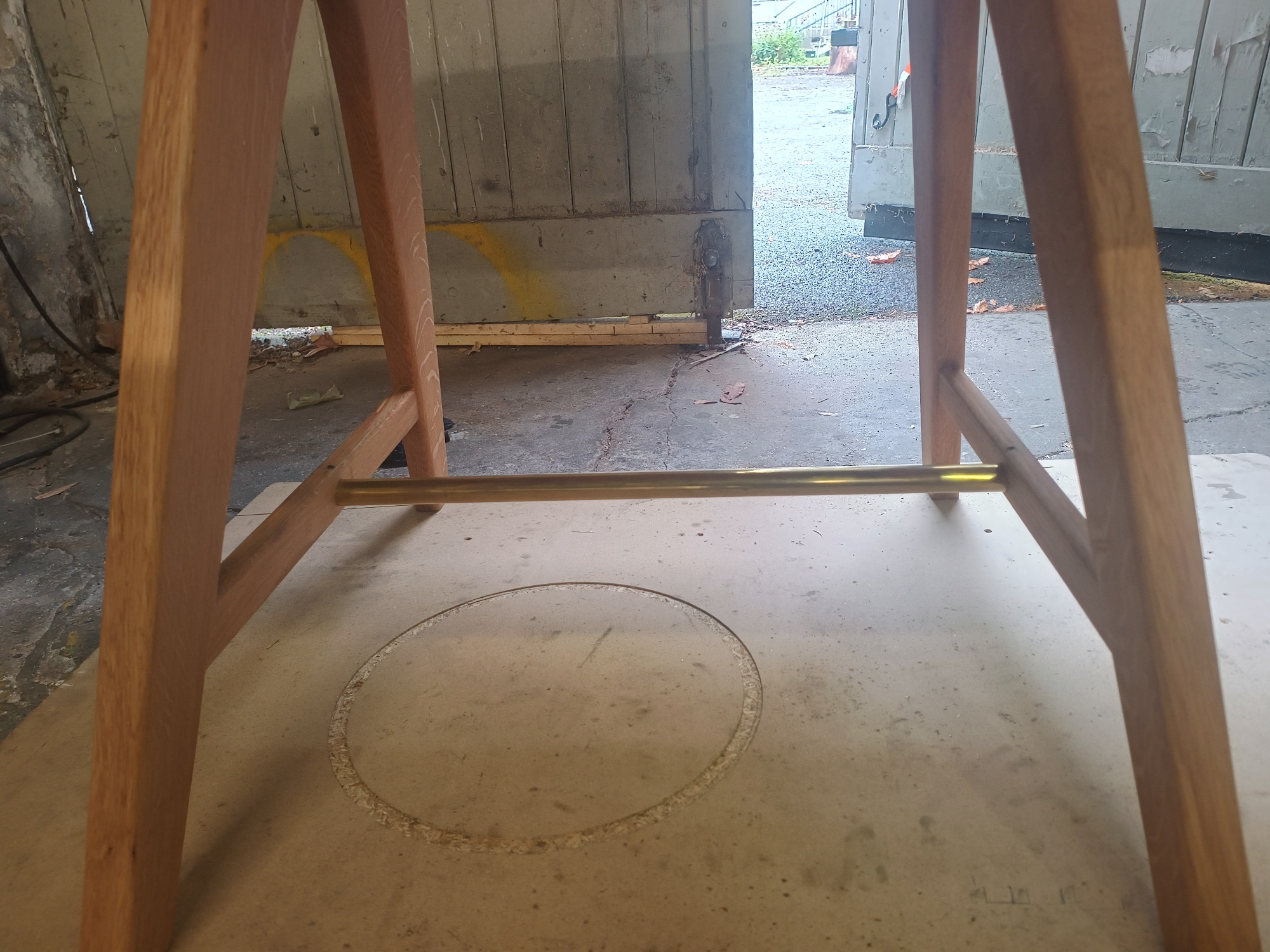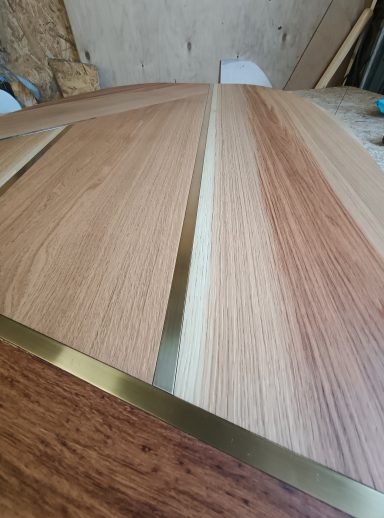 Dieser Tisch bietet Platz für sechs Personen und wurde von mir speziell an die individuellen Bedürfnisse meiner Kundin angepasst. In die massive Eichenplatte sind Intarsien aus massivem Messing eingearbeitet, die dem Möbelstück eine elegante und unverwechselbare Note verleihen. Auch das Verbindungsrohr zwischen den Tischbeinen besteht aus Messing und sorgt nicht nur für zusätzliche Stabilität, sondern fügt sich harmonisch in das Gesamtdesign ein. So entstand ein einzigartiger Tisch, der handwerkliche Präzision, edle Materialien und funktionales Design perfekt miteinander verbindet.
