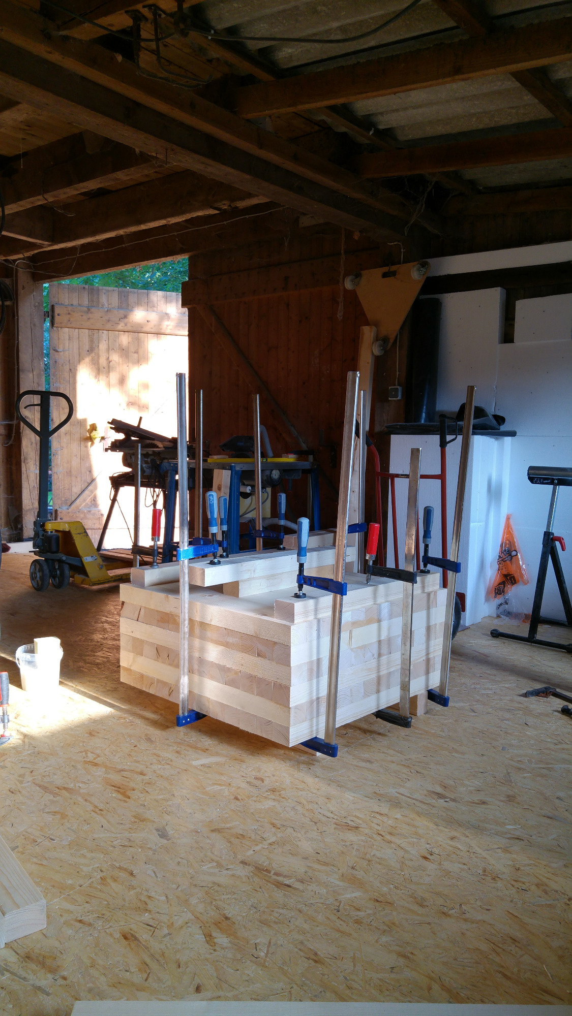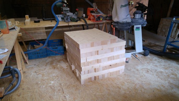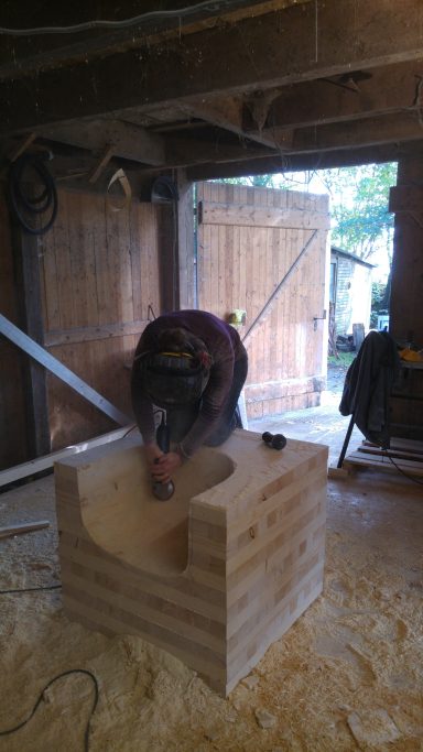 Diese kleine Sitzgruppe, bestehend aus zwei Sesseln und einem Beistelltisch, habe ich gemeinsam mit der Künstlerin Laura Massmann für die Lobby eines Konzerns entworfen und gefertigt. Die Möbel wurden aus einem massiven Holzquader gearbeitet, der aus verleimten Fichtenbalken entstand. Dadurch wirken die Stücke wie aus einem einzigen Block geschnitzt.